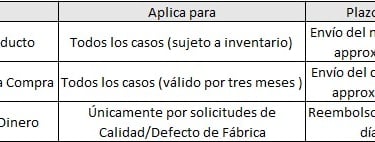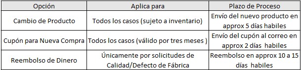 Una vez recibido y verificado el estado del producto en nuestro centro de distribución, el Usuario podrá escoger entre: